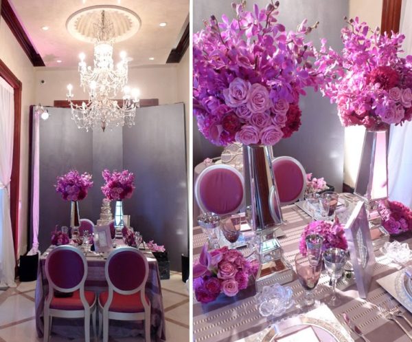 Позолота стеблей и листьев роз, используемых в центральных предметах, создает ощущение потустороннего богатства. Важно уделить внимание десертам, которые покрыты глазурью цвета фуксия и декоративной позолотой. Можно покрыть шарики шоколадного торта марципаном, а затем придать им отличительную вишневую форму и безупречную отделку, покрывая их тонированным маслом какао.