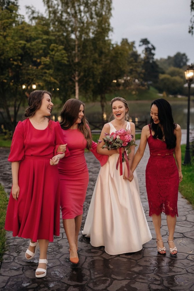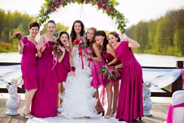 Будущая новобрачная должна взять этот вопрос под личный контроль. Подруг нужно поставить в известность о тематике свадьбы заранее. Молодая должна дипломатично выяснить, у кого из девушек какой любимый цвет и какие наряды есть в гардеробе. Затем остается найти компромиссное решение и спокойно ожидать дня церемонии.