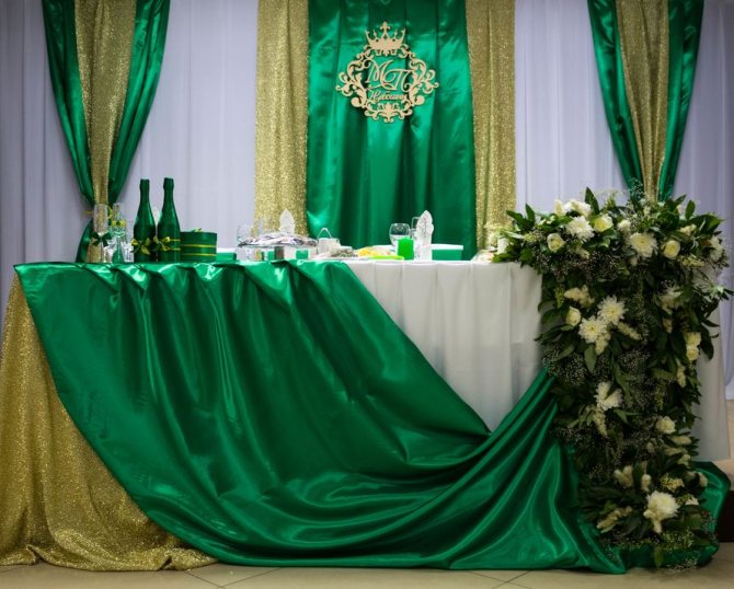 Выбрав изумрудный оттенок в качестве основного, можно почувствовать единение с природой, вызвать положительные эмоции у гостей и зарядить торжество позитивной энергией.