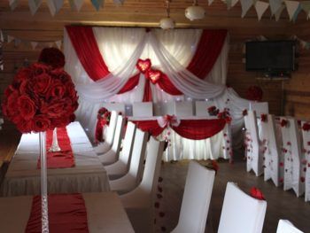 Если церемония проходит в закрытом помещении, арку, стены и колонны драпируют лёгкой светлой тканью и украшают алыми бантами. Для окон используют кружевные шторы с красными подхватами.