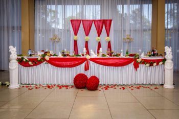 Место за новобрачными украшают тканью, воздушными шарами и шторами оттенка скарлет. Дорожку к столу посыпают лепестками алых роз.