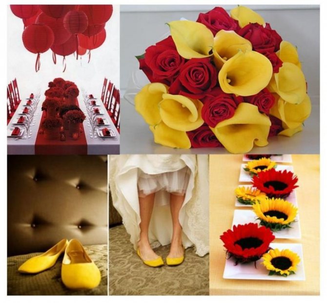 Красный не может выступать как единственный цвет на свадьбе, поэтому необходимо знать, какие ещё оттенки можно использовать для придания торжеству изысканного дизайна. Сочетается яркая гамма как с холодной, так и с тёплой палитрой.