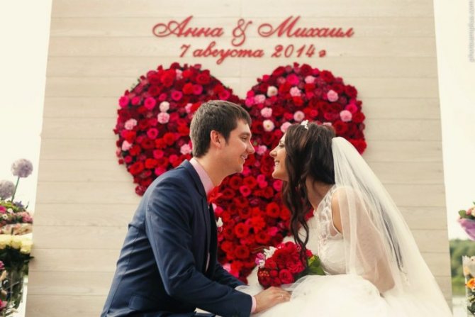 Площадку для проведения церемонии украшают романтической атрибутикой: фигурками в виде сердечек, лепестками, гирляндами, букетами из живых цветов.