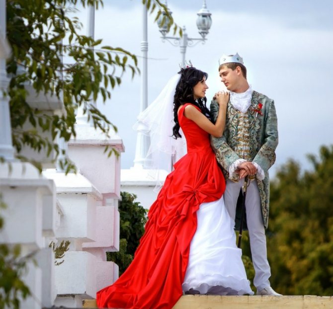 Красный цвет в одежде сделает вашу пару ярче, эффектнее. Для начала Вам следует определиться с оттенком: на осенней свадьбе лучше будет смотреться бордовый, терракотовый, на зимней — алый, огненно-красный, на весенней и летней стоит задуматься о розовых и коралловых оттенках.
