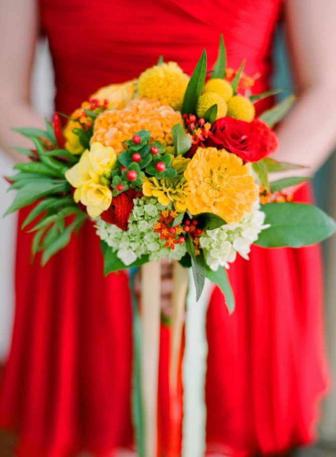 Декорируя свадьбу в ярком цвете, нельзя обойтись без букетов. Среди угощений можно расставить вазы с маками, розами, фрезиями, пионами, георгинами.