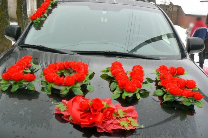 Поэтому оптимальным считаются украшения машин в красные и белые ленты, сердца, гирлянды, что выглядит безумно красиво и придает кортежу обособленный вид.