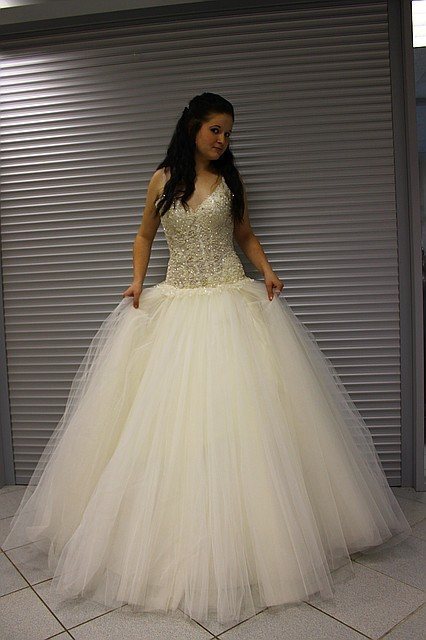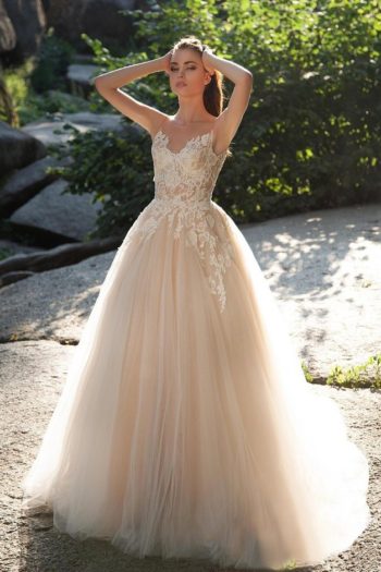 - Пышное с большим количеством подъюбников или с кольцами – идеальное сочетание. Поскольку образ получается невероятно нежным. Если подобрать лиф, расшитый стразами, можно удивить гостей чувством вкуса. Нередко такие наряды кутюрье исполняют из сложной кружевной ткани или гипюра.