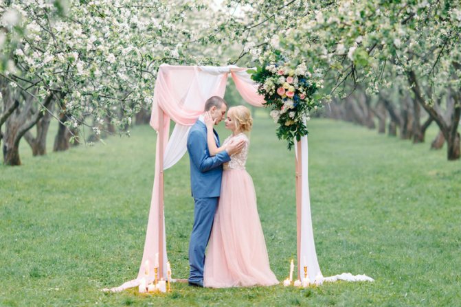 Правильно подобранный декор позволит передать изысканную колористику свадьбы в цвете пудры. Основной цвет должен присутствовать не только в нарядах жениха и невесты, но и оформлении праздничного пространства, где будет проходить выездная церемония и свадебный банкет.
