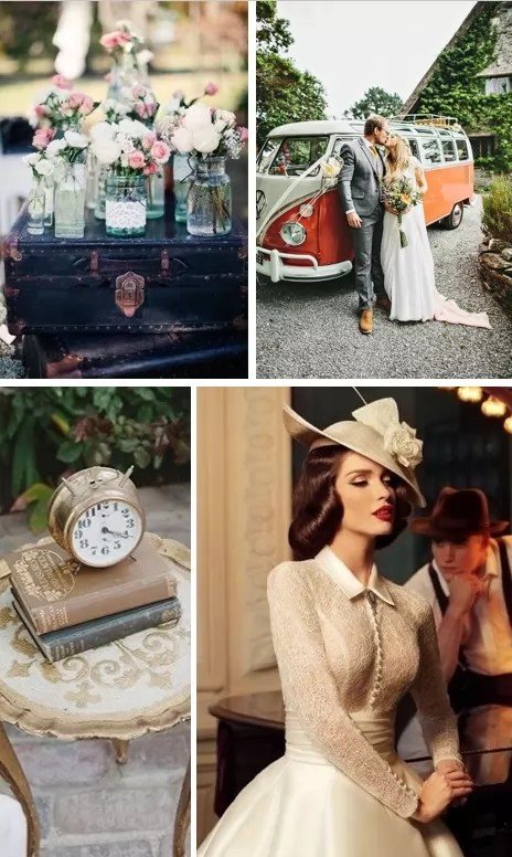 Ретро свадьба — это выдержанные временем детали, создающие особую атмосферу праздника. Состаренное дерево и потертая керамика, старинные книги, чемоданы, камеи, канделябры, посуда, печатная машинка и телефон.