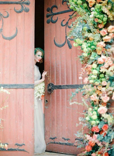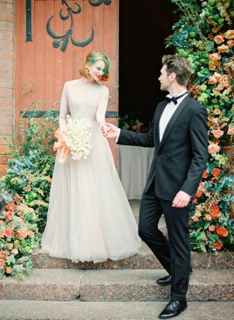 Англиканская церковь Святого Андрея со своими башнями и барельефами стала основой для арки на этой стилизованной съемке. Кирпичная арка 1880-х годов, увитая плющом, придала обстановке нотку аристократической классики. Посмотрите, какая замечательная весенняя зелено-оранжевая асимметричная цветочная арка получилась у ребят!