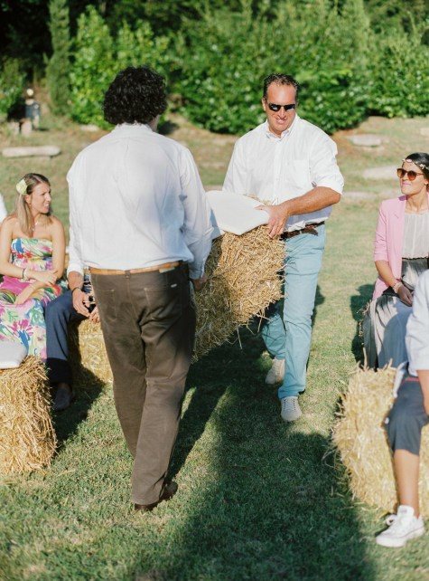 Посмотрите, как здорово придумали Аня и Симонэ провести регистрацию. Их роспись проходила на закате на арене, с которой было видно все вокруг. Арка была оформлена ползучими лианами. Вместо стульев они поставили брикеты из сена, положив на них подушки. Сидя на них напротив друг друга, они и обменялись кольцами.