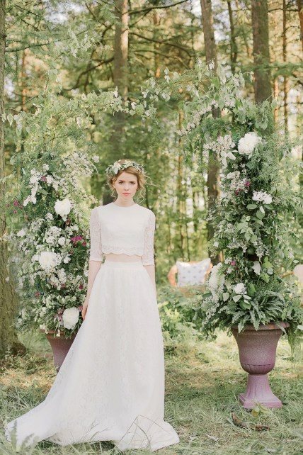 Выбранный стиль фотосессии «Лесная свадьба» подразумевал наличие в декоре мха и других растительных, «лесных» элементов. Для регистрации была выбрана потрясающая лесная локация в черте города, украшением которой стала арка, выполненная в виде вертикальных цветочных композиций в горшках.