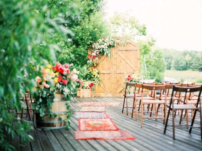 На летней свадьбе Леши и Ники в стиле рустик в уютном месте на Пироговском водохранилище роль арки с успехом исполнила дверь, установленная на пирсе и украшенная цветочной гирляндой. Цветы стояли и по бокам — на деревянном ящике и бочке. Посмотрите, как стильно это выглядело!