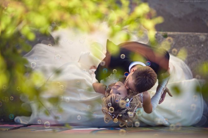 А вот оригинальные и креативные свадебные фотографии получаются при использовании приемов, которые предполагают не только сам метод съемки, но и последующую обработку в графических фото-программах с наложением особых фильтров. Это позволяет достичь запоминающихся эффектов. Например, взять хотя бы просто черно-белые свадебные фотографии. Скучно и прошлый век – скажете вы? Ничего похожего! Этот стиль – в дизайнерском тренде и обыгрывается также спецэффектами.