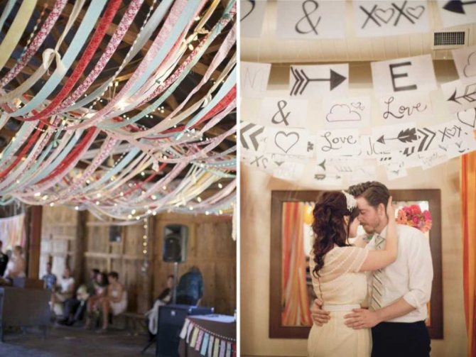 Особое место в декорировании свадебного зала занимают ленты, они прекрасно сочетаются со всеми видами украшений, выглядят нарядно и стильно. Такой декор подойдет для любой свадьбы: традиционной, тематической, в стиле бохо или лофт, свадьбы а-ля рюс или в цыганских традициях. Для свадьбы в рустикальном стиле хорошо подойдет сочетание атласных лент и кружева. Оформление зала на свадьбу лентами хорошо смотрится как в закрытом помещении, так и на выезде, среди природы.