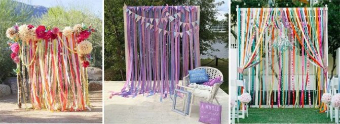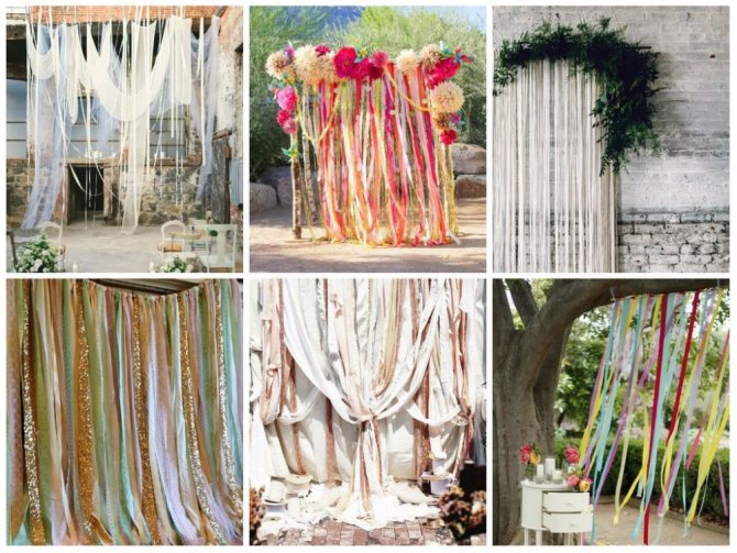 Декор предполагает множество вариантов. Можно использовать их для оформления арок или стены за молодоженами. Если в оформлении задействована арка или устойчивая конструкция, то достаточно перевить ее широкими лентами двух контрастных цветов и украсить цветами или шарами. Гирлянды из лент могут образовывать фальш-стену для фотосессии или красиво свисать с потолка, крепиться на люстрах.
