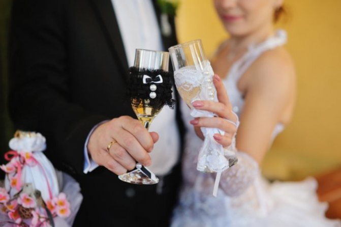 Традиция бить на счастье бокалы для шампанского постепенно уходит в прошлое. Но вы можете оформить своими руками несколько пар. Из одной новобрачные пьют в ЗАГСе, из другой – во время застолья, а третью, самую простую, можно и разбить.