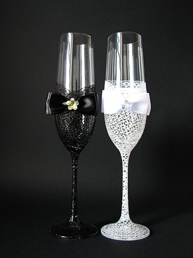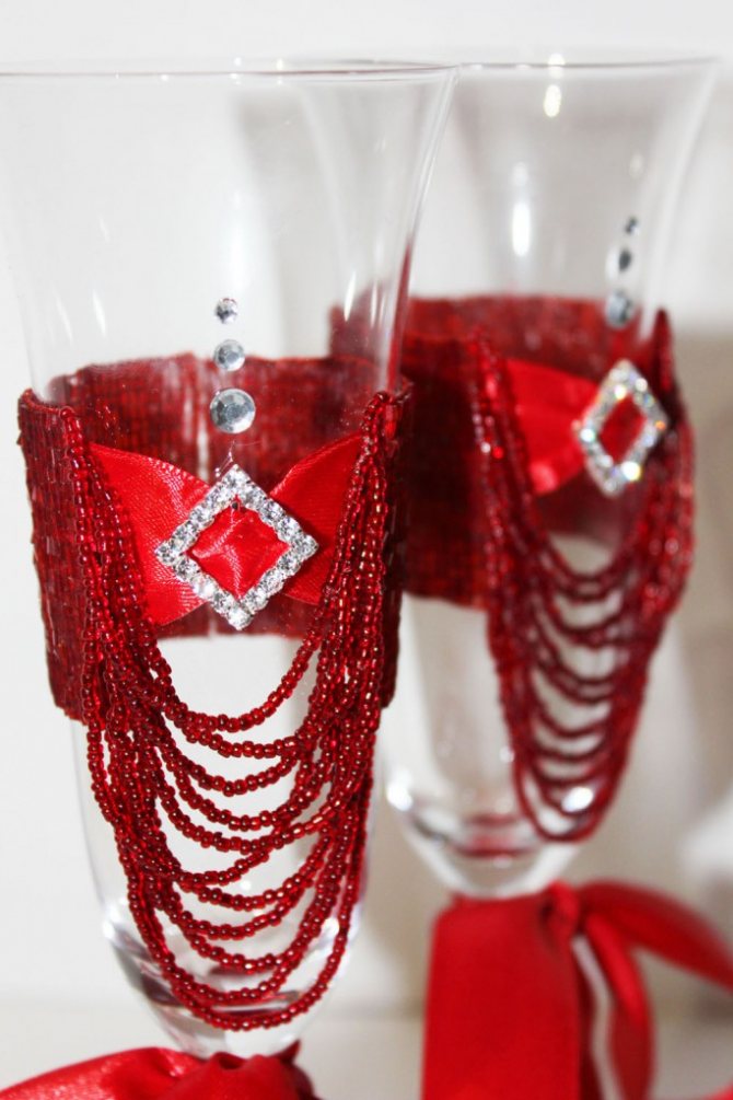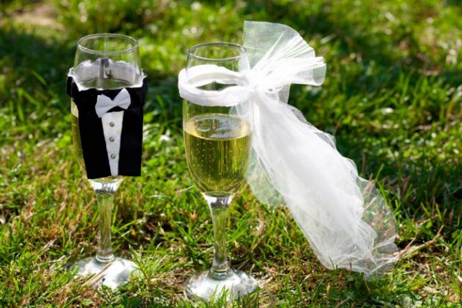 Оформление бокалов для шампанского будущие новобрачные могут поручить специалисту. Но гораздо интереснее сделать это своими руками невесте, заодно продемонстрировав свои навыки рукодельницы и хороший вкус. При наличии терпения и аккуратности у вас получатся настоящие произведения искусства.