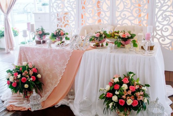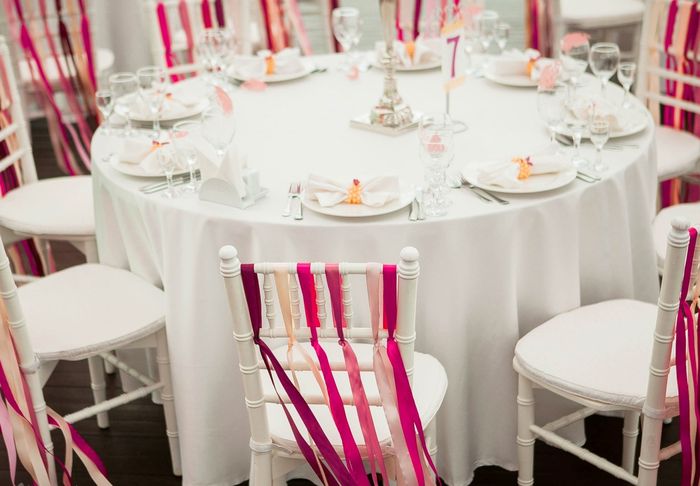 Для скатертей и чехлов лучше приобрести более плотную ткань, способную хорошо держать форму. Традиционный цвет – белый, однако в последнее время в моду вошли «цветные» свадьбы, использующие яркие, контрастные цвета.