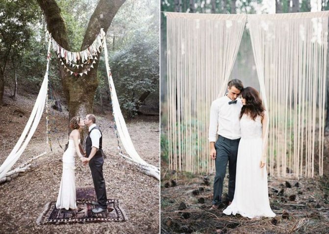 Более неформальные свадебные украшения из атласных лент подойдут для стилей инди, хипстер, рустик, хиппи, витаж, шебби-шик. А геометрически правильное расположение рапс, лент, веревок ближе направлениями Tiffany, авангард, Ар-нуво, барокко, классика и пр. Приглашая фотографа на торжество, хорошенько подумайте об аэросъемки. Растрепанные на ветру ленты смотрятся удивительно с высоты птичьего полета.