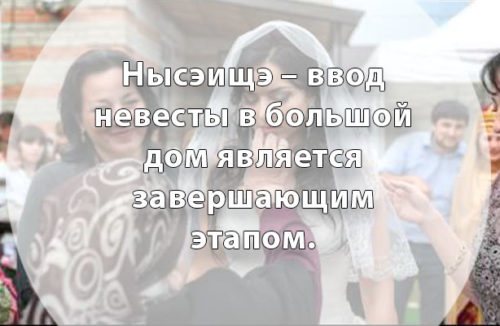 Нысэищэ – обряд, когда невесту заводят в большой дом, т.е. на половину старших. Здесь с ней знакомятся взрослые женщины, мать, родственницы. На этом свадьба завершается.