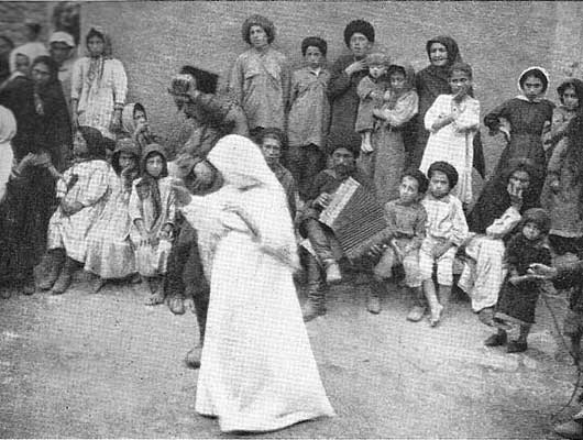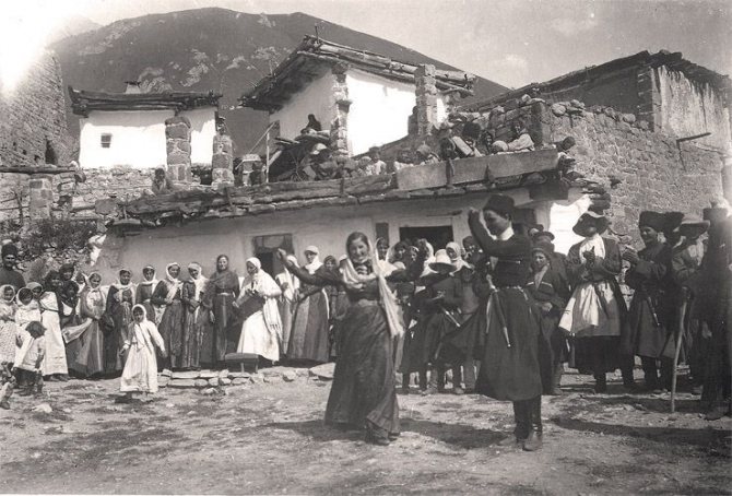 В круг выходило 10-12 мужчин и столько же женщин; они становились друг против друга, образуя полукруги. Сначала танцевали женщины, а мужчины-партнеры, стоя, хлопали; затем, когда женщины проделывали, танцуя, несколько кругов, они становились полукругом и начинали хлопать, а мужчины, танцуя, делали круги перед женщинами.На пороге дома, у ворот, молодые парни преграждали путь невесте, требуя выкуп: спиртное и закуску к нему. Цена выкупа была выше, если девушку выдавали замуж в другое село.