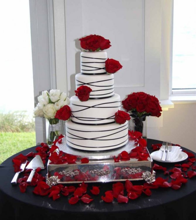 А если вы не хотите далеко отдалятся от классического стиля, но вам нужно внести некой пикантности в мероприятие, то советуем использовать черный цвет на своей свадьбе, а изюминку банкету придадут черные свадебные торты.