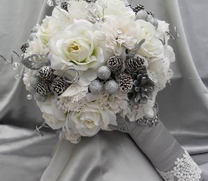 В этом букете все искусственное — белые розы, которые соединены с крашенными шишками, пластмассовыми листочками, посыпанными блестками и декоративной изогнутой проволокой. Украшен такой букет дорогим фатином, обшитым ажуром, а также металлическими украшениями с камнями. Любая невеста с таким букетом в руках будет выглядеть, как принцесса.