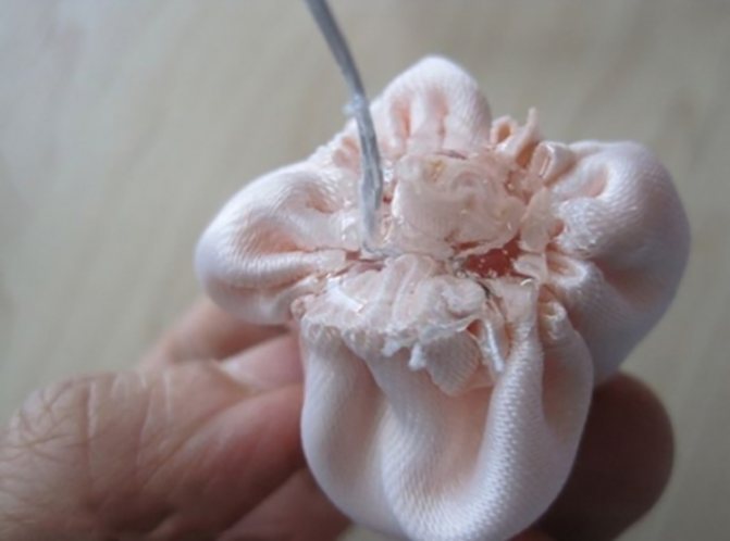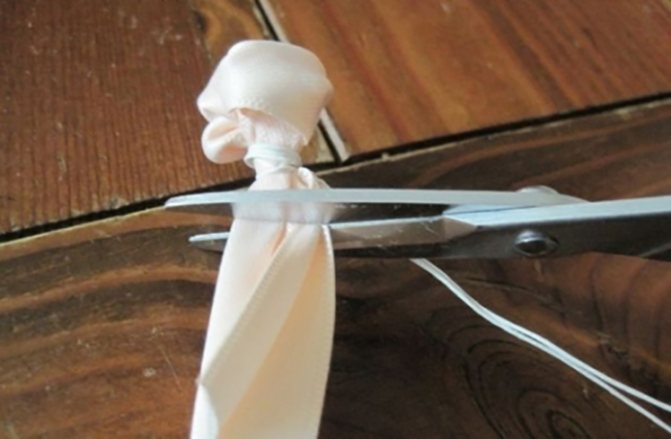 - Серединка такого бутона изготавливается из отрезков ленточек. Они должны быть перевязаны нетугим узлом: