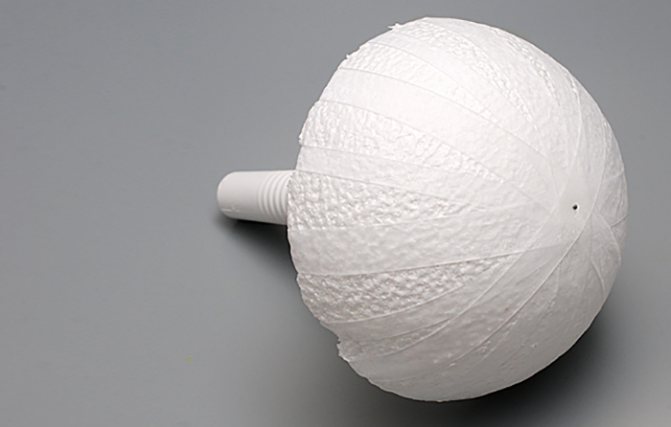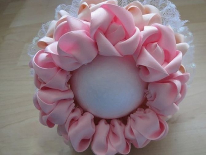 - Получившимися бутонами вам нужно по кругу обклеить пенопластовый шар так, чтобы между цветами не оставалось никакого просвета:
