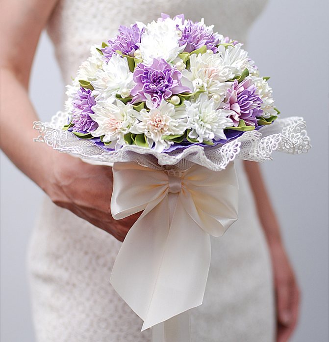 Когда мы представляли вам вариант букетов из роз для невесты, мы указывали, что к каждому бутону для красоты можно приклеить бусинку, чтобы букет смотрелся более изысканно. То же самое вы можете сделать и с хризантемами. Букет от этого будет нежнее и романтичнее.