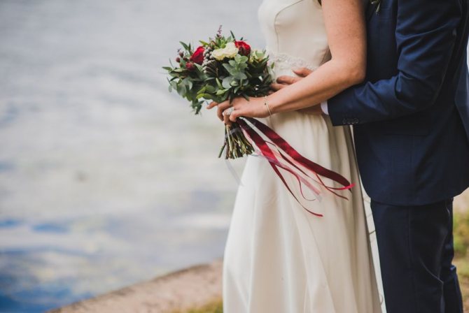 Другой оттенок белого допустим в качестве компромиссного решения, но важно аккуратно его выбирать, иначе более тёмная вещь визуально окажется неопрятной. Впрочем, всегда существует вариант с цветным нарядом – и в этом случае белый букет, бесспорно, незаменим. Особенно чувственно подобное сочетание смотрится на ретросвадьбе, если у невесты тёмное платье.