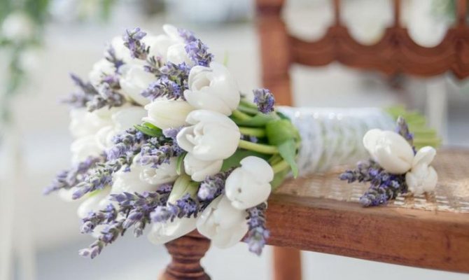 Если вы играете свадьбу ранней весной, то будут хорошо смотреться букеты из белых тюльпанов, с которыми отлично сочетается нежно-сиреневая лавада.