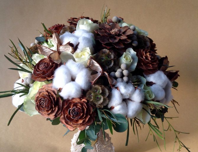 Этот букет похож на предыдущий, но в нем вместо ели обычная зелень, которая используется даже в весенних и летних букетах, больше декоративных роз, которые сделаны из шишек, немного белых роз и ватных бутонов. Украшен такой букет на ручке кружевами, бусинами. Тоже ничего лишнего, шик букету придает игра оттенков, которые мастерски сочетал между собой флорист.