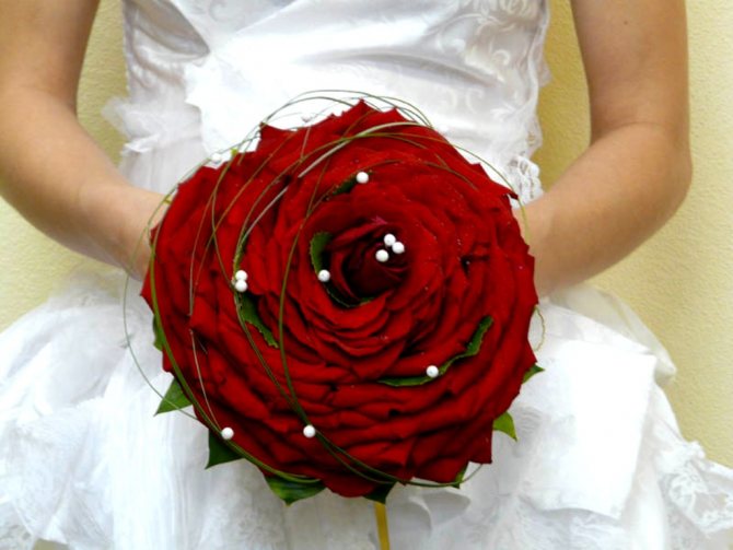 - Букет «Розамелия». Он выглядит, как одна большая роза. Нечасто невесты заказывают именно такие букеты, потому что стоят очень дорого (флористы вручную склеивают из лепестков розы огромный букет так, чтобы он напоминал один большой бутон), но нужно отметить, что смотрятся они достаточно оригинально.