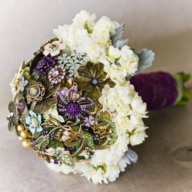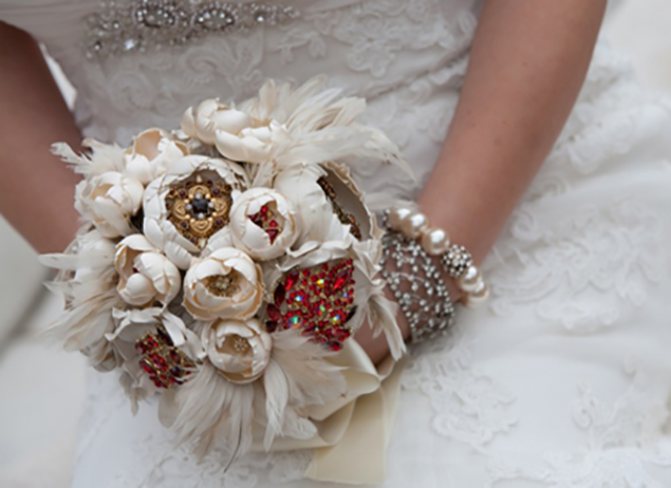 - Букет-брошь. Это нестандартное решение для букета, потому что в нем используется минимум цветов и много камней и прочих украшений. Чаще всего такие букеты выигрышно смотрятся на свадьбах, которые проводятся зимой. Главное преимущество такого букета заключается в том, что он может стать отличной семейной реликвией, которая будет передаваться из поколения в поколение.