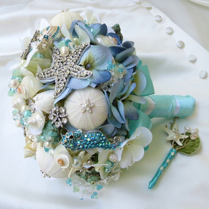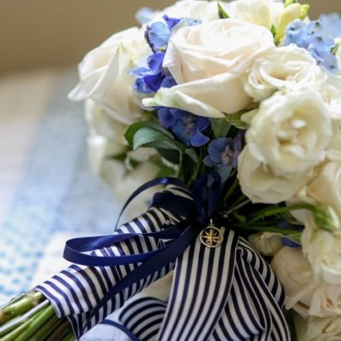 - Морской букет. Это букет из нежных раскрытых в бутонах цветов, которые украшены кружевами или полосатыми ленточками. Идеальных вариант для свадеб, которые играются на берегу моря.