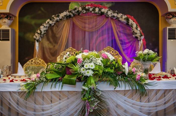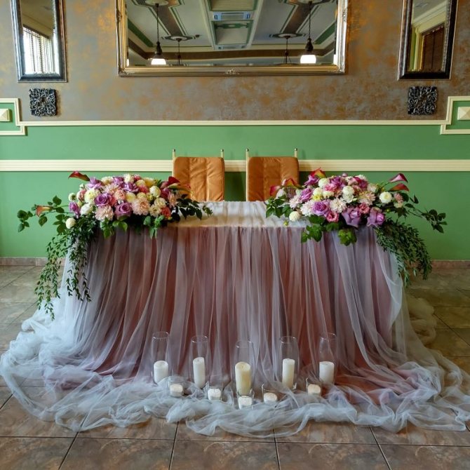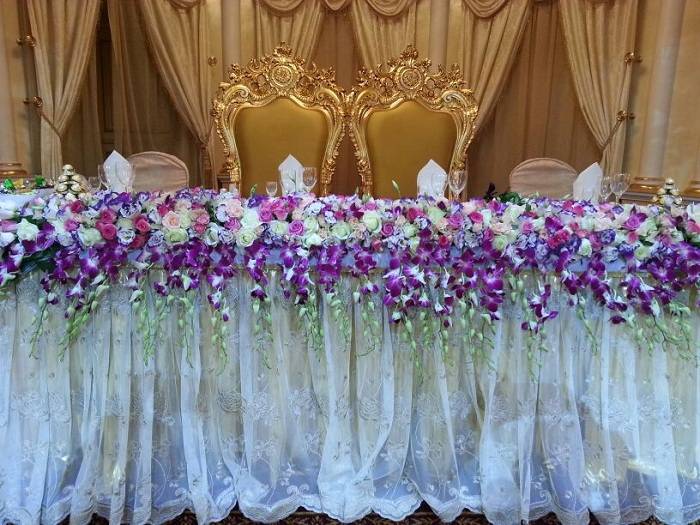 К столу новобрачных взгляды присутствующих прикованы в течение всего вечера, поэтому он должен быть украшен по-особенному. Но объёмные высокие композиции не должны закрывать лиц молодых и не препятствовать общению с гостями, подходящими с поздравлениями.