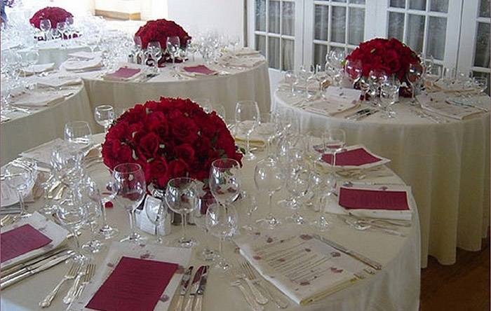 Прежде всего, это употребление не слишком ароматных бутонов для декорирования свисающей части скатерти и не очень длинные стебли для цветов в вазах.