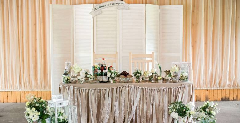Столешницу следует задрапировать тканями и украсить цветами. Это могут быть икебаны, гирлянды, одиночные композиции. Как бы то ни было, именно здесь должно быть отведено особенное место для праздничного торта, ведь это один из важнейших элементов свадебного торжества.