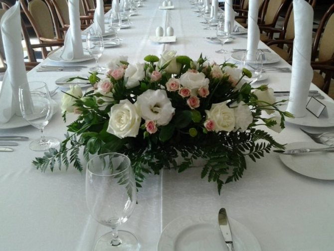 Особое внимание должен привлекать стол жениха и невесты, а невысокие цветы желательно расположить так, чтобы они не закрывали лица молодоженов. Свадебные композиции обычно состоят из нескольких видов цветов или зелени, гармонирующих между собой
