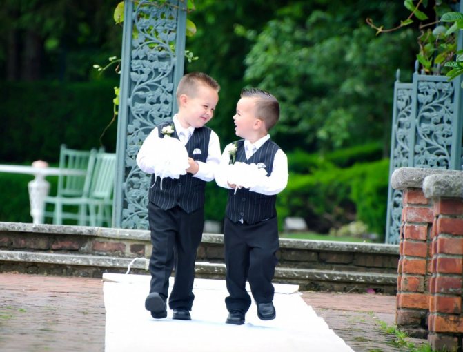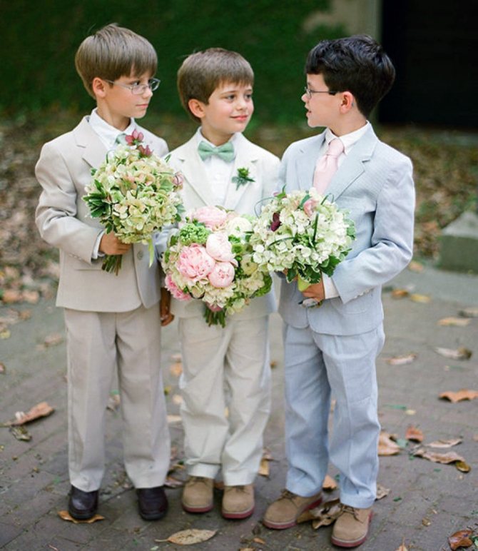 Костюм мальчика должен хорошо на нем сидеть, не стесняя движений. Очень мило смотрится костюм мальчика, повторяющий костюм жениха или его отца.