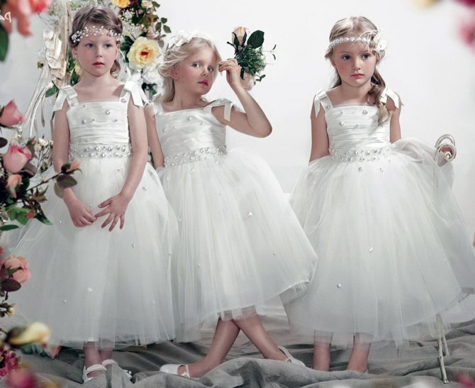 Для пошива свадебных нарядов для детей преимущественно выбирают легкие, воздушные ткани, которые легко драпируются. Стилисты рекомендуют отдавать предпочтение шелку, атласу, тафте. Также используется органза, шифон, вискоза, но это искусственные ткани, поэтому они менее удобные в носке.