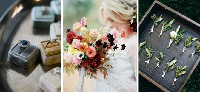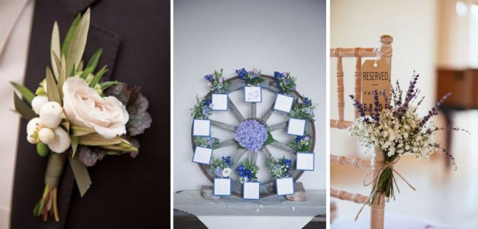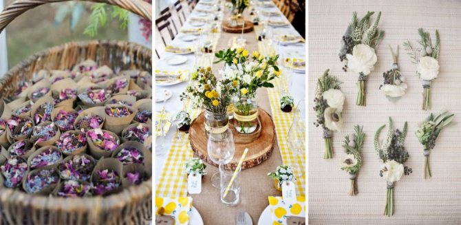 Соцветия должны отличаться от бумаги, поэтому используют оранжевые или лавандовые цветки. Часто на пригласительных изображают настоящие травы или колосья. Для бонбоньерок используют холщовые мешочки или вручную завёрнутые в рогожу или бумагу подарки.