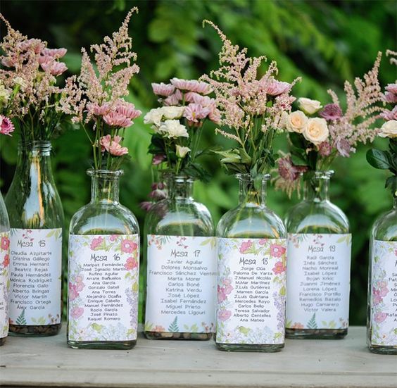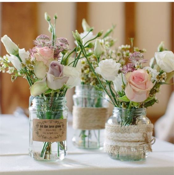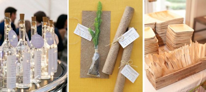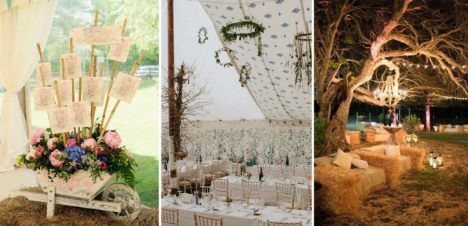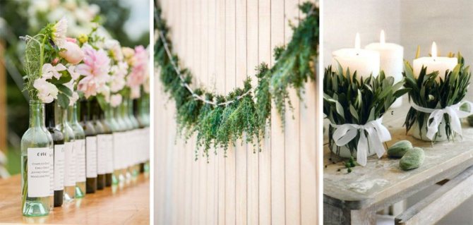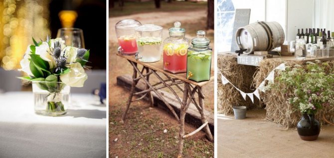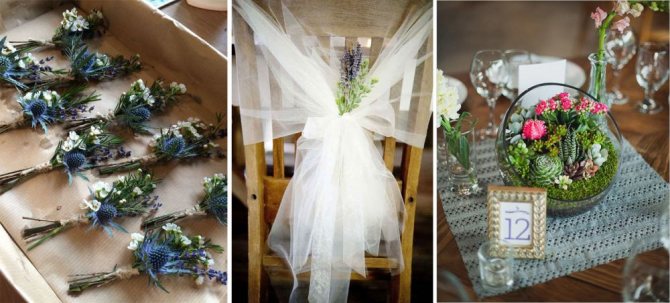 При декорировании столов и площадок для церемонии или танцев используют свечи, букеты в простых вазах или обычных бутылках. В моду входит использование суккулентов и хлопковых коробочек, помещённых в банки.