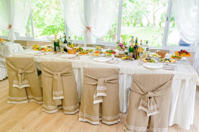 - Рассадочные карточки. Номера столов можно вырезать из пенопласта (их следует указать в пригласительных) и приклеить к срезам любого дерева. Сами же «карточки» удобнее всего прикрепить к спинке стульев. Также будет красиво наполнить мешочки сеном, перевязать вверху бечевкой и прикрепить с лицевой стороны к ним бумагу с номером столов и именами гостей.