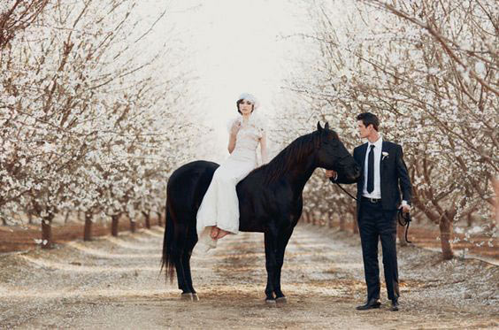 - Невеста может сидеть верхом на лошади, при этом жених ведет скакуна неспешным шагом, как бы контролируя весь процесс. Оба смотрят в камеру.