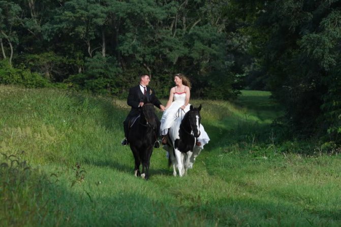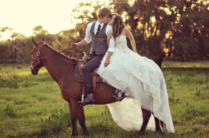 - Невеста может сидеть на лошади одна, а жених стоять рядом. При этом оба тянутся друг к другу, чтобы поцеловаться.