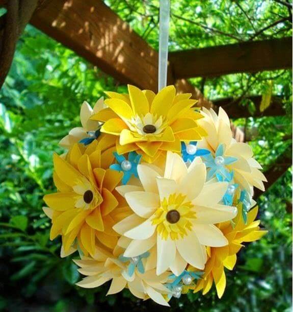 Теперь давайте приступим, как нам сделать большие бумажные цветы. Я предлагаю начать с такой яркой и радужной композиции- шара, который запросто можно повесить на обеденным столом в гостиной или в углу зала.