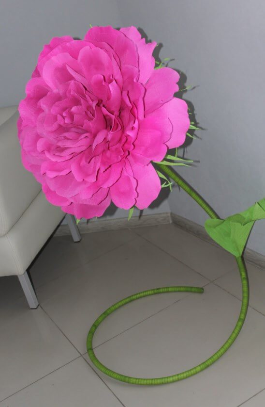 Когда речь идет о ростовых цветах, не сразу можно поверить, что эта красота создана из бумаги. Но гофрированная обладает необычными свойствами – в статье об изготовлении маленьких цветов мы подробно их рассматривали. Напомним, что для ростовых гигантов более всего подходит крепированная бумага плотностью не менее 120 г с А и В-флютом (складками глубиной 1,6 и 3,2 мм) – это позволит лепесткам держать форму.